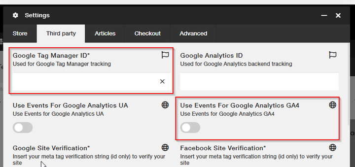 Enter GTM ID and switch on "Use Events For Google Analytics 4". Note that the GTM ID is language specific which makes it possible to have one GTM container for each language. It also means that you need to add the ID for every language the shop uses.