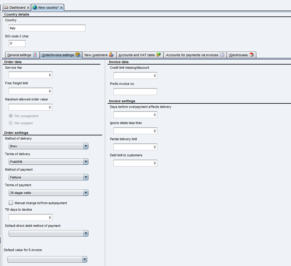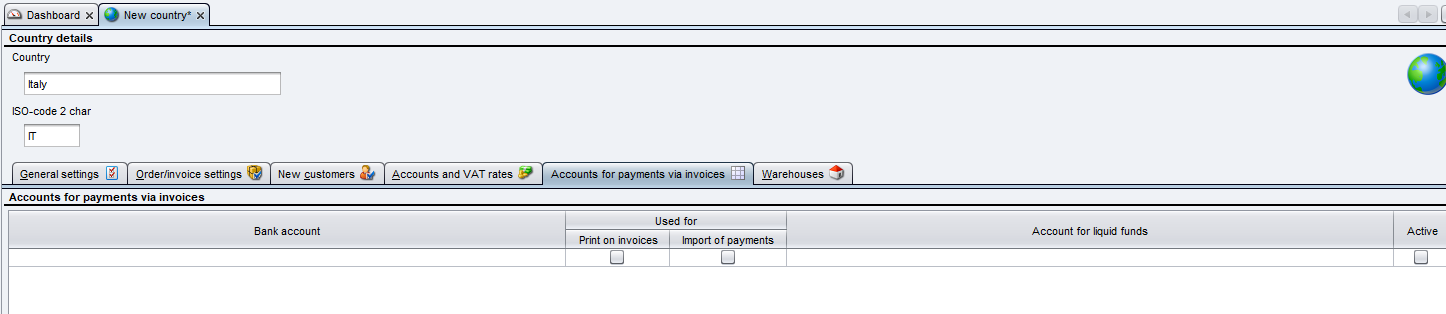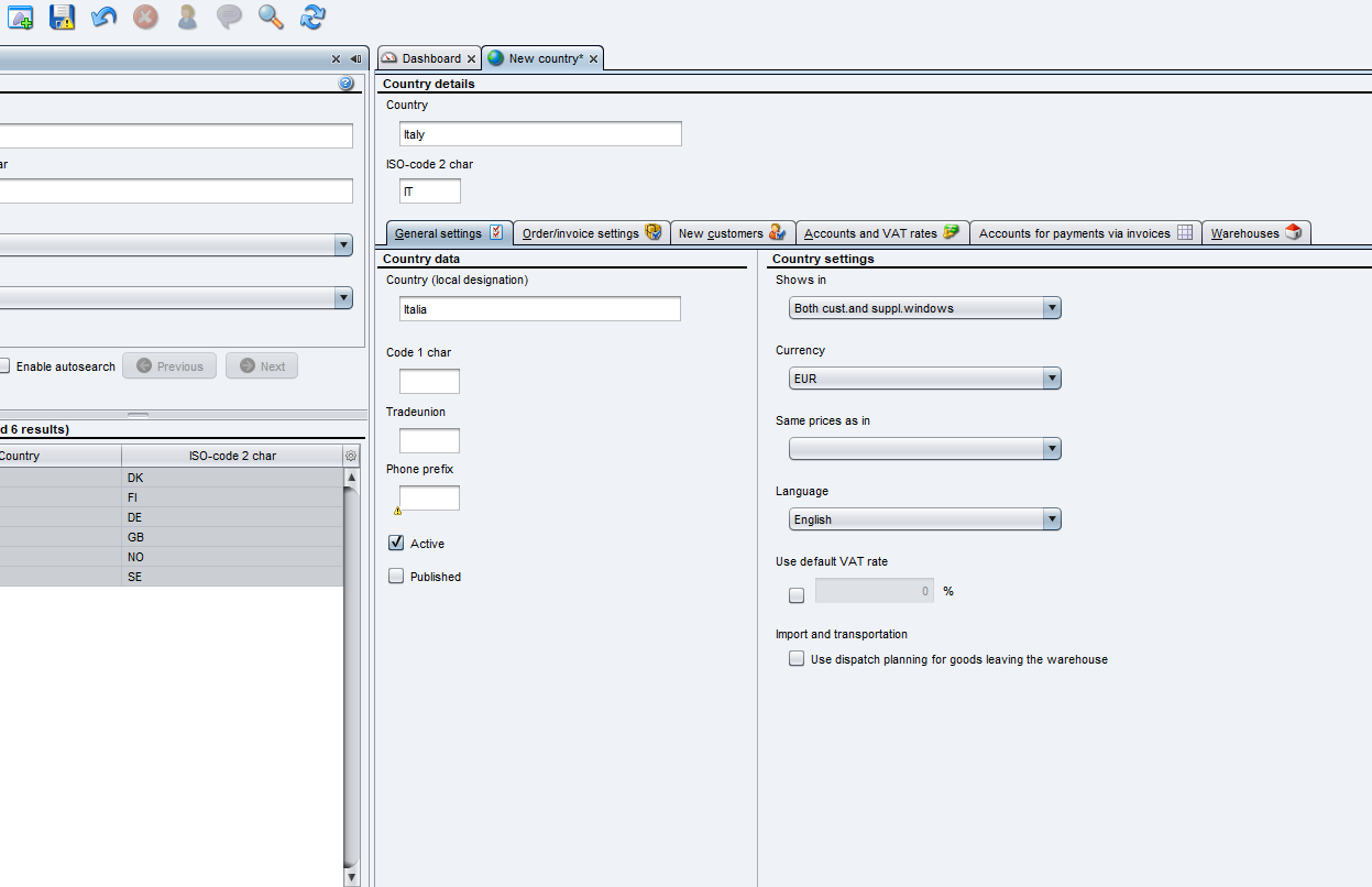 Enter name of “country” and “ISO-code”, the ISO code exists of two letters, e.g "IT" for Italy.