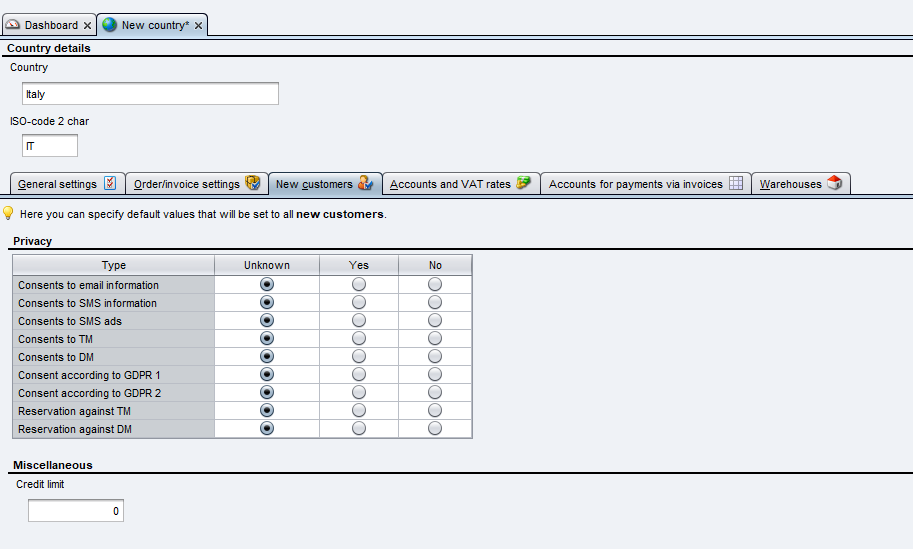 Specify your choice of privacy settings, e.g. if a new customer should have the setting that they automatically consents to recieveing email information.