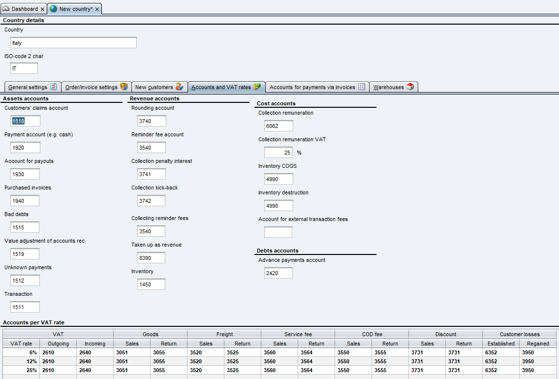 Enter your book keeping accounts and VAT rates that should apply for the country.