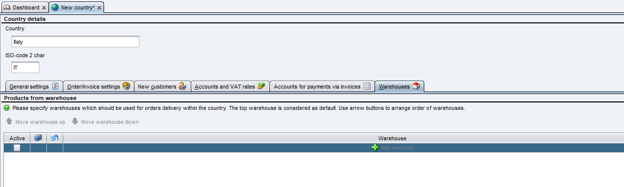 Enter the warehouse that this country should use. Note that the warehouse needs to be created before adding it in this tab. Please note that this field is only shown if you have multiple countries active.