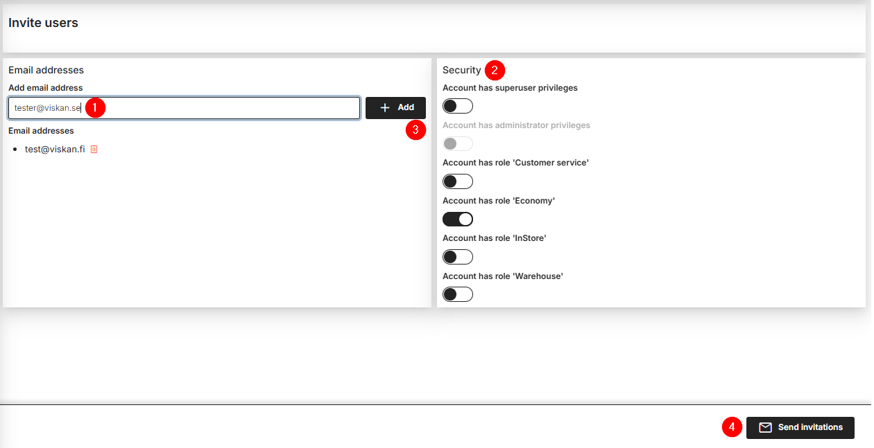 - First add email address, then add security/privilige setting for that user. Note that the user needs to belong to at least one user group.