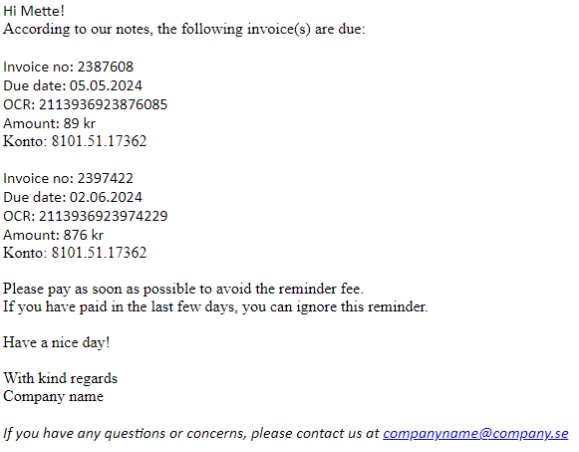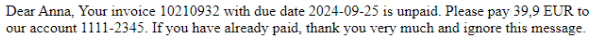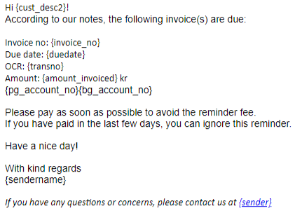 Dear {cust_desc2}, Your invoice {repeat}{invoice_no} with due date {duedate} is unpaid. Please pay {amount_invoiced} EUR.{/repeat} to our account {IBAN}. If you have already paid, thank you very much and ignore this message.