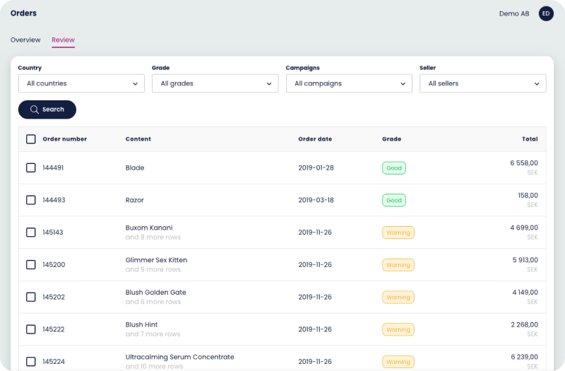 Under the review page you can review orders, you can again filter it by country but “Grade” has replaced “Status” - There are 3 different grades, “Good”, “Warning”, “Severe Warning”. Which indicates if there’s something wrong with the order. For example the customer hasn’t paid its invoices or reached its credit limit.