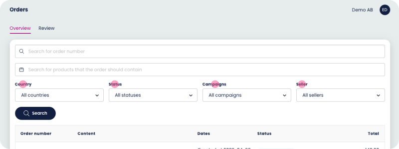 This allows you to filter orders by their current status in the fulfillment process, such as "All statuses", "Planned", "Placed", "Delivery created", “Party delivered”, “Delivered”, “Canceled”.. This can be useful for tracking the progress of orders and identifying any bottlenecks or delays in the fulfillment process.