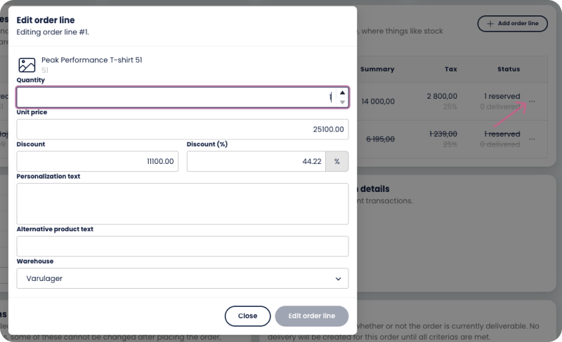 From here you can edit the quantity, unit price, add discount and other information like personalized text that can for example be used for engraving a product. Adding an alternative product text specifies a customized name of the product for this specific order. This will be used for example when printing the invoice and the delivery note.