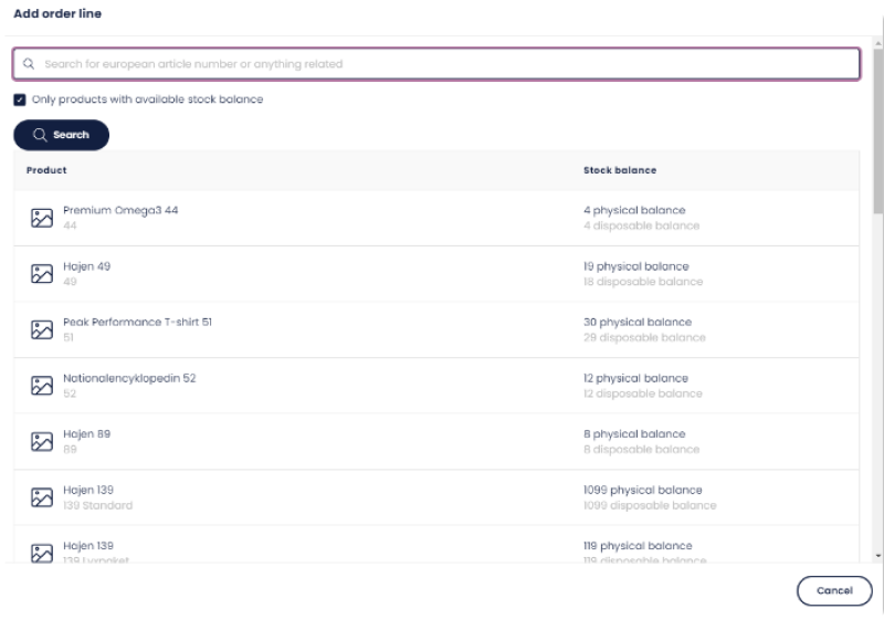 Once you add a new order line you will get a popup of articles where you can filter “In stock” or search directly for the product: