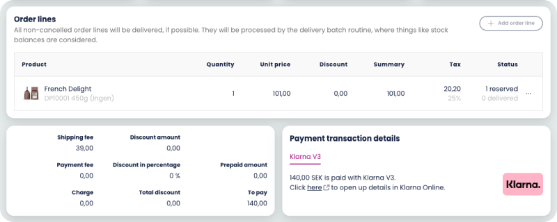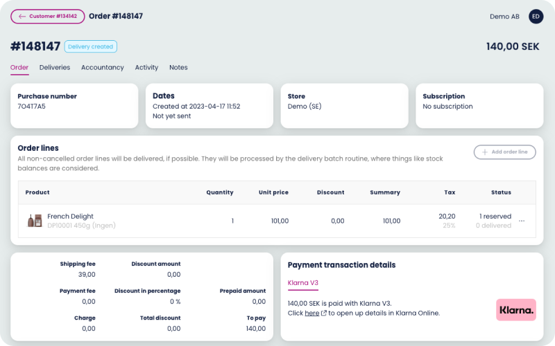 First view shows the first rows of information regarding the order. Purchase number, creation date, store and if it’s a subscription or not. You get a clear overview of what product that has been ordered. In this case below the delivery has already been created.