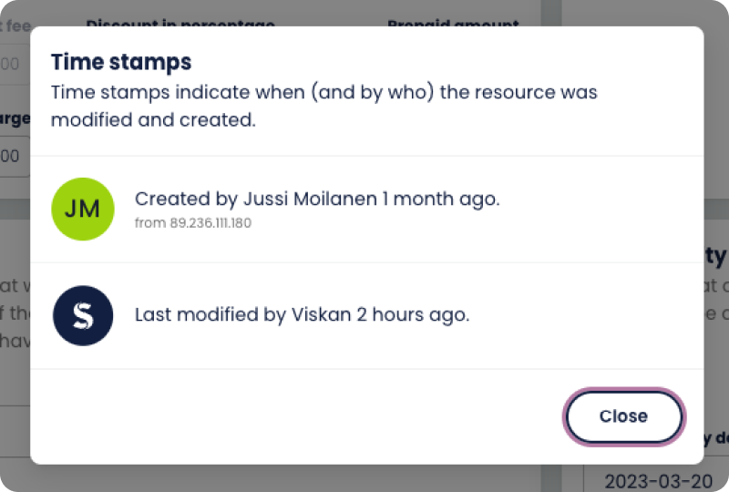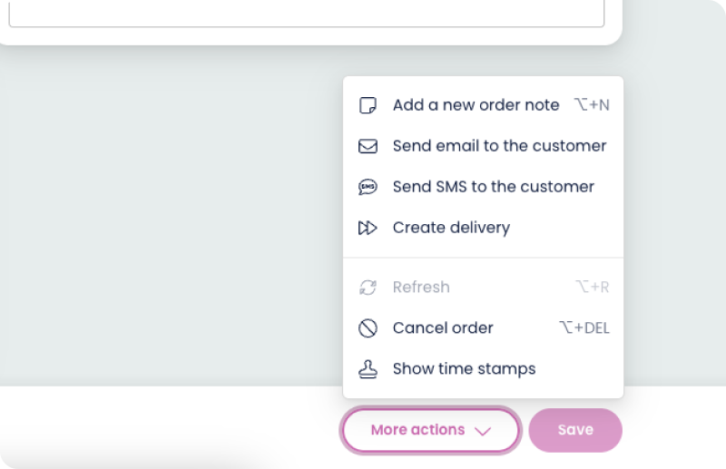 There are more things you can do on the order page, on the footer you have the option to either save changes you’ve done on the order or more actions, where you can basically add an order note. You can send an email with templates connected to order, you can send SMS to the customer regarding this order but then you’ll need to have that implemented from a third party named “LinkMobility '', you can choose to create the delivery directly for this customer or cancel the order. “Show timestamps” gives you information about when certain events have been created in this order.