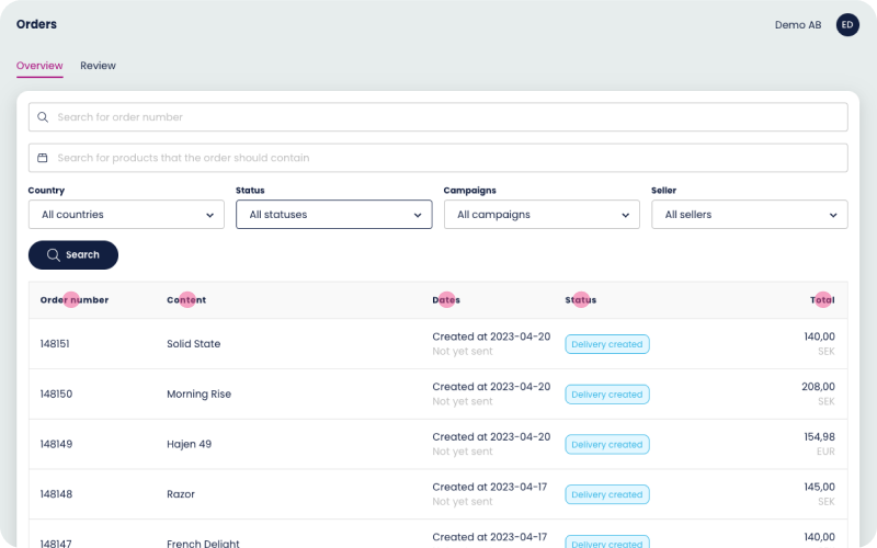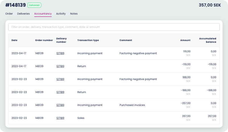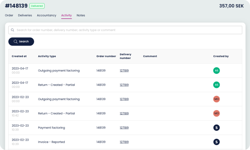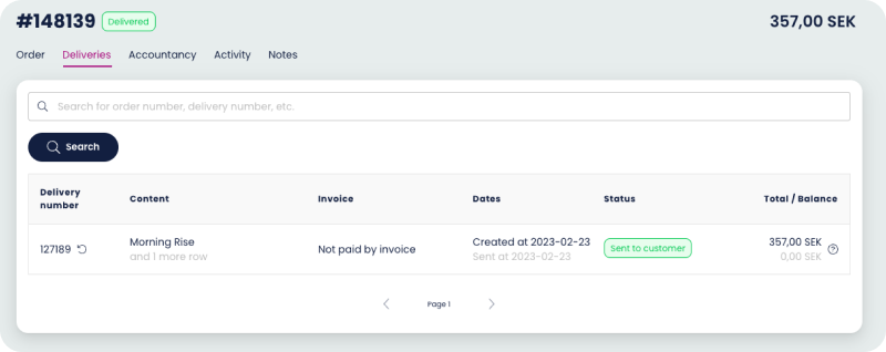 Here you get a clear overview of the delivery number and the same information as the order view and also if it’s been paid with an invoice or not.