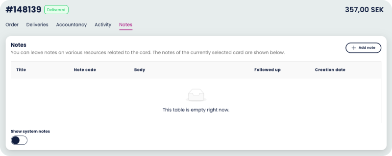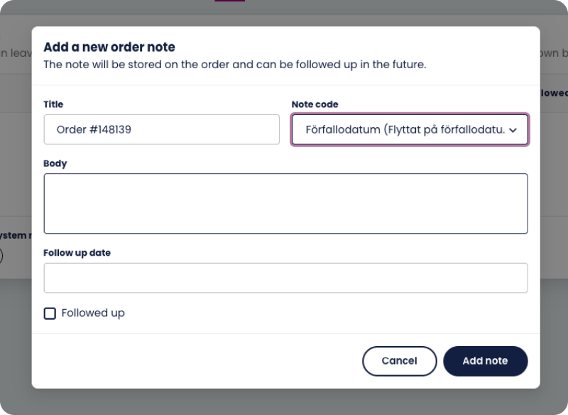 If you wish to add a note you simply click on the “Add note” button. Here it’s mandatory to add a “note code” and write a specific text under the body. This is more information for yourself and your colleagues.