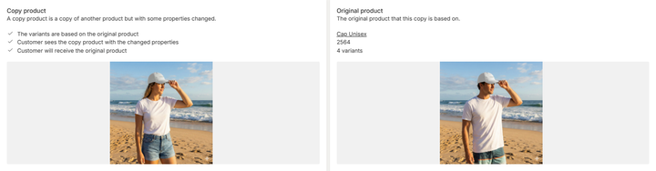 - Copy product: Shows the new properties you just created (what the customer sees).