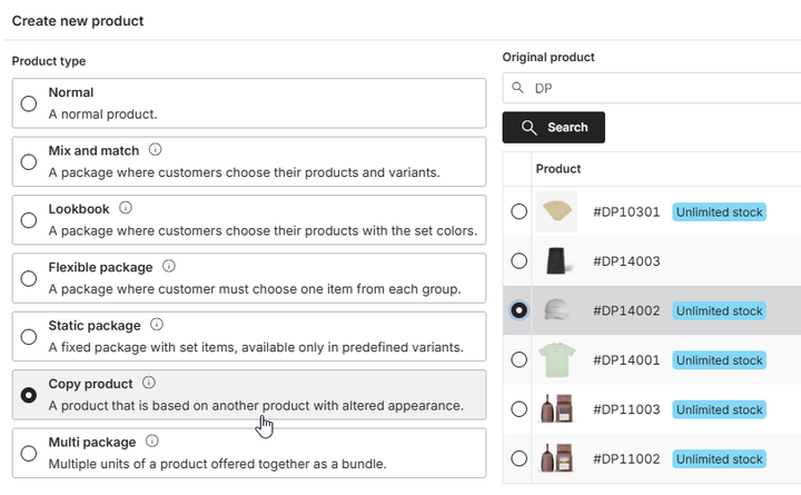 - Search for and select the Original product in the right-hand panel. This will immediately create the new product and copy all settings, variants, and prices from the original.