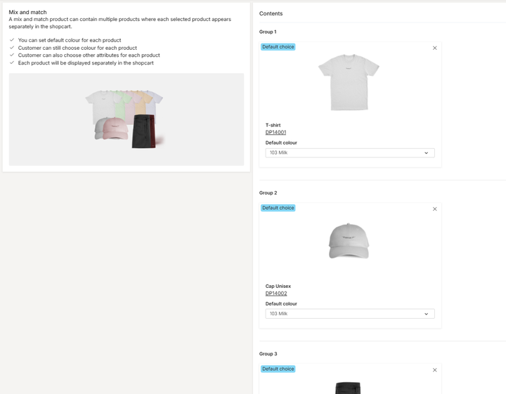 - The product is added to "Group 1". You must select a Default colour. This is the pre-selected option the customer will see when they land on the page, matching your main package image.