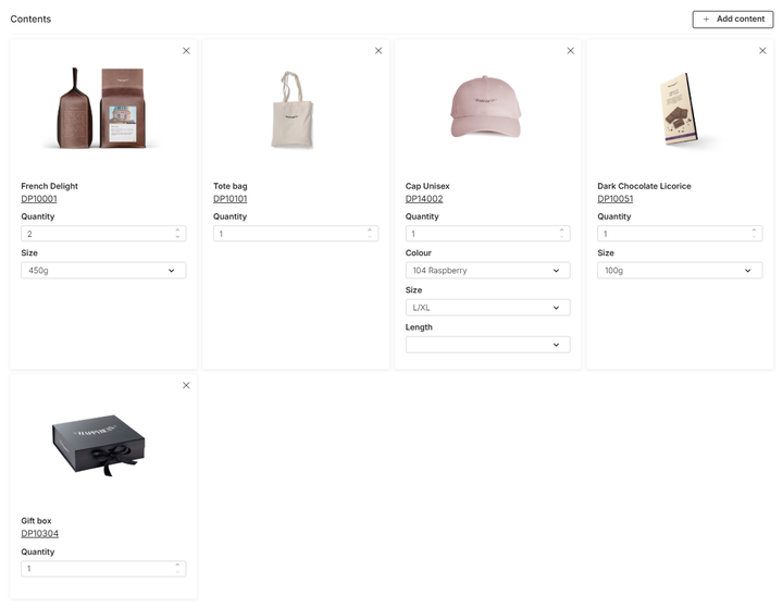 - For every product you add, you must define exactly which version the customer gets. First, set the Quantity to determine how many units of this item are included. Then, select the Variant to lock down specific attributes. Example: If you were building a "Christmas Evening Set", you could add a ceramic mug, set the quantity to 1, and select a variant such as "Christmas Red". Next, you might add a scented candle, set the quantity to 1, and choose a variant like "Ginger & Orange". Finally, you could include a box of chocolates with a quantity of 1, selecting the standard option if the product has no attributes.