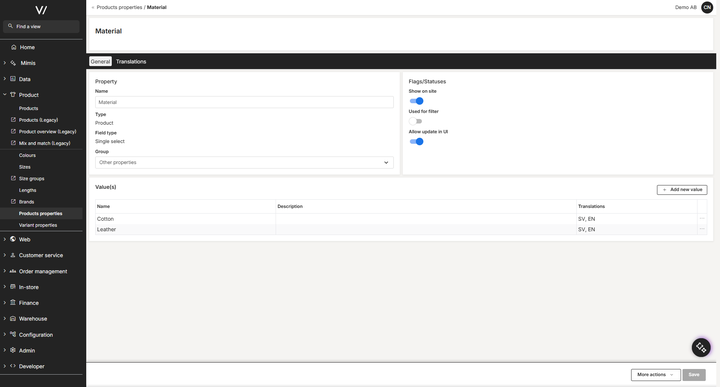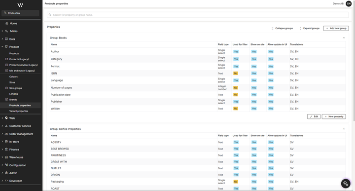 Product properties in Viskan Backoffice allow you to define specific characteristics and attributes for your products, such as material, format, flavor profile, or technical specifications.