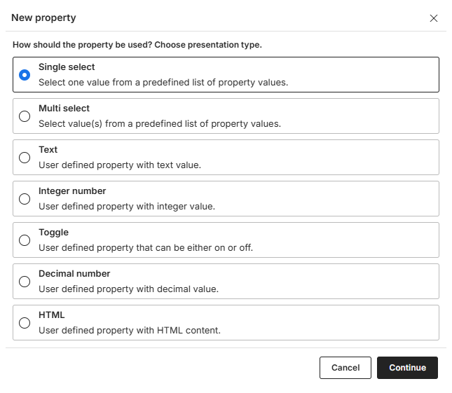 When you click + New property, you are first prompted to choose how the property should be used and presented. Because different product attributes require different types of data, you must select a Field type.