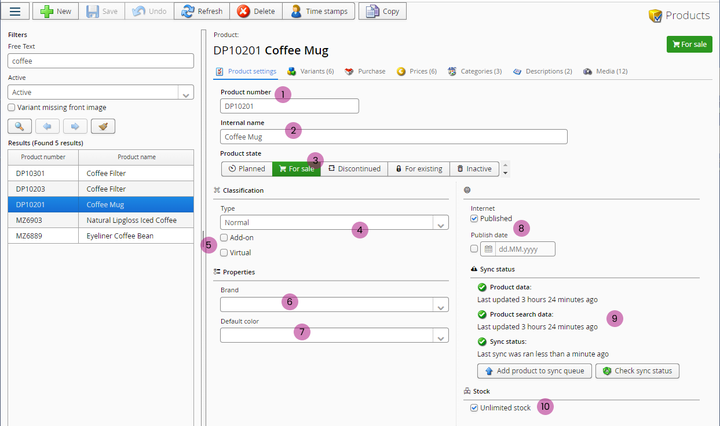Describes the status of the product - most common options are "For sale" and "Inactive".