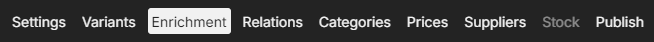 The Enrichment tab contains all content and descriptive information used to present the product to customers. This includes product text, images, and product properties. These elements are essential for creating a complete and informative product page.