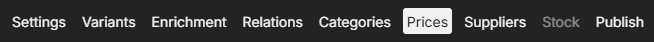 The Prices tab is the central hub for managing the commercial data of your product. Here, you define how much your product costs across different markets, currencies, and customer groups.