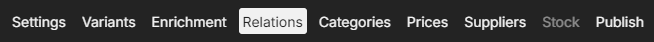 The Relations tab contains several sub-tabs, each representing a different type of product relation.
