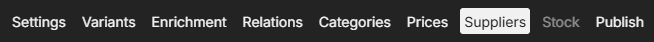 The Suppliers tab allows you to manage the procurement and sourcing details for your product. While the Prices tab handles what you charge your customers, this tab handles your relationship with vendors. Here, you connect your internal variants (such as specific colors or sizes) to the external manufacturers or distributors that supply them.