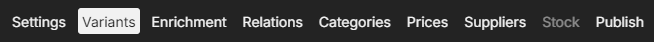 The Variants tab lists all variants for the product. Every product in the PIM has at least one variant, and some products may have multiple variant attributes configured (for example size, color, or length). Depending on the setup, a product may use one, two, or all three attributes.