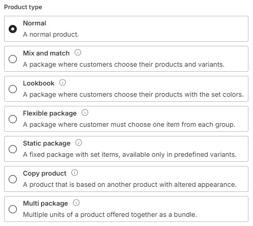 When creating a new product in Viskan Backoffice, choosing the correct product type is the first and most critical step. The product type determines how the product behaves in the online store, how it is displayed in the shopping cart, and what options are available to the customer.