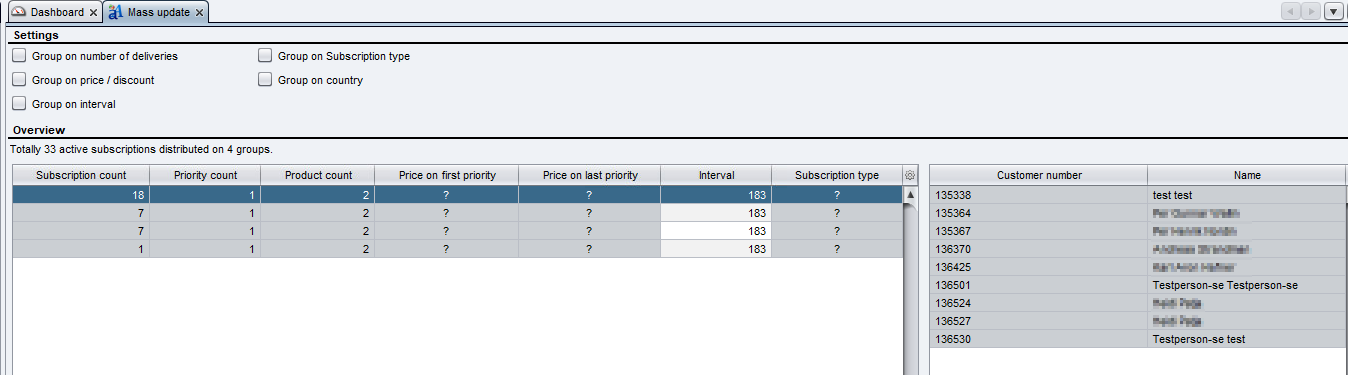 On right side of the overview window, you'll see a limited list of customers that have a subscription that is exactly same with your matched grouping. Remember that there can still be question marks for columns like "Delivered quantity" if you only group by price / discount.